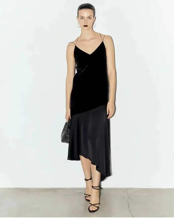 Por otro lado nos encontramos con este vestido largo de terciopelo con volante en el bajo y tirantes finos: una oda absoluta a la elegancia. Gracias a su textura suave, es posible afirmar que estamos ante una de las mejores opciones de cara a la Nochevieja. No obstante, también puedes utilizarlo en estilismos más informales, combinándolo con una camiseta básica debajo y con tus zapatillas blancas de confianza. Cuesta solo 29,99€ y está disponible en El Corte Inglés.