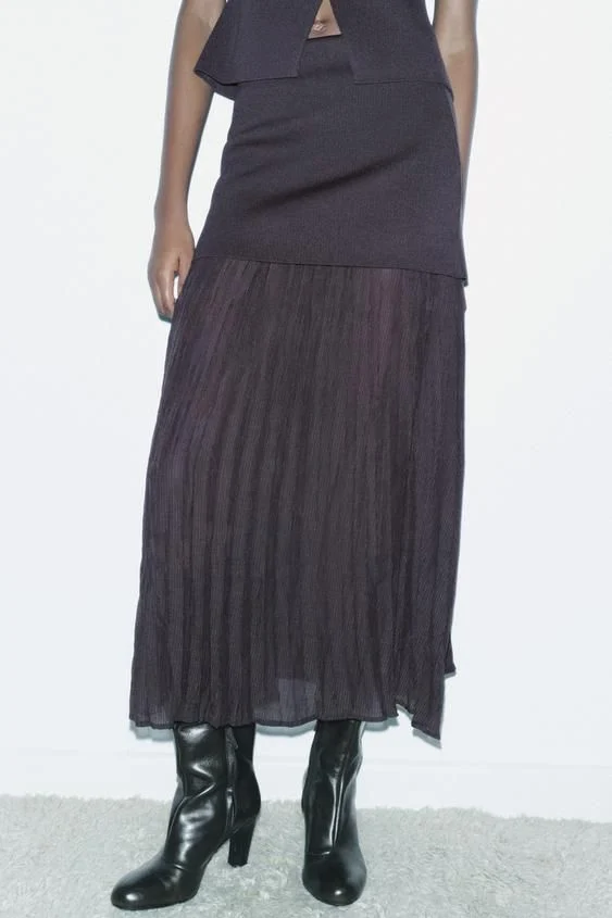 La falda combinada plisada de Zara es una de esas prendas que logra un equilibrio perfecto entre elegancia y comodidad. Con un diseño de tiro alto y una cintura elástica, proporciona una silueta estilizada y se adapta fácilmente a diferentes tipos de cuerpo. Esta falda es ideal para quienes buscan un toque cómodo para sus looks de diario, pero también para una ocasión especial, gracias a su originalidad y versatilidad.