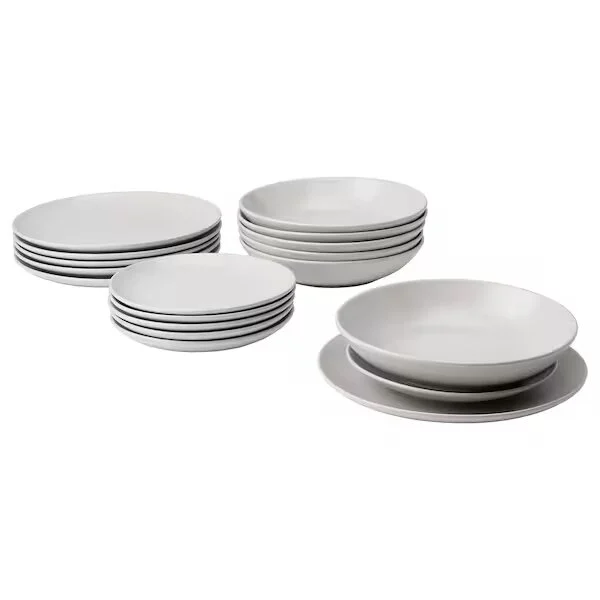 El set FÄRGKLAR trae consigo 18 piezas distribuidas en tres tipos de platos: seis platos pequeños de 20 centímetros (cm), seis platos grandes de 26 cm y seis platos hondos de 23 cm y un 1 litro (L) de capacidad; ideales para guisos y sopas. Con estas opciones a tu alcance, podrás servir una comida completa hasta para seis personas; una alternativa perfecta para eventos como Nochebuena o Año Nuevo.