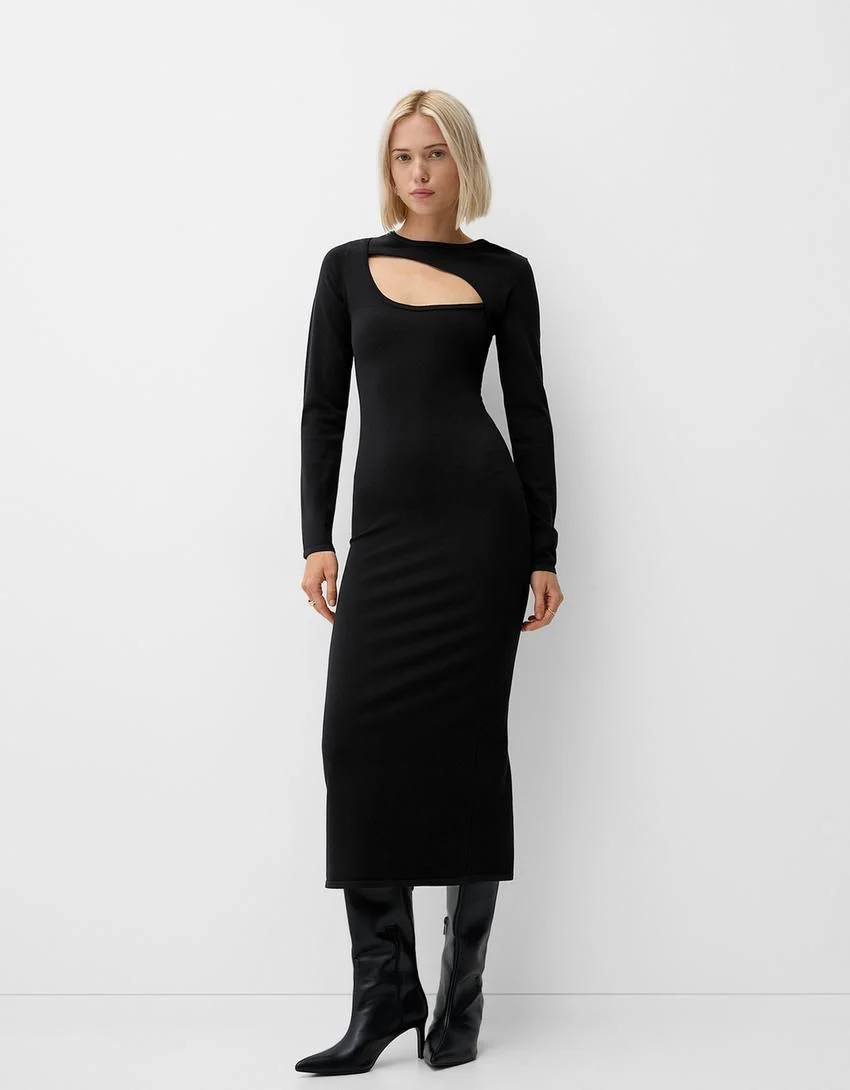 Por solo 29,99 € , este vestido midi es ideal para eventos nocturnos y celebraciones especiales. Su corte midi favorecedor, combinado con el detalle cut-out, resalta tu figura mientras te permite moverte con total libertad. El color negro, atemporal y versátil, asegura que puedas combinarlo fácilmente con cualquier accesorio o calzado, creando un look impactante para recibir el nuevo año.