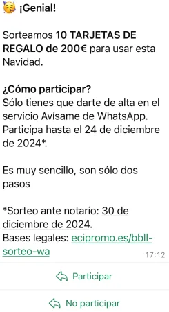 El nuevo sorteo de El Corte Inglés se denomina, ‘Sorteo registro avísame Whattsapp ECI Navidad’, que se desarrolla dentro del territorio español y termina este mismo martes 24 a las 23:59 de la noche. Una promoción gratuita para el consumidor y que no implica en sí misma un incremento del precio de los productos y/o servicios que participan en la promoción.