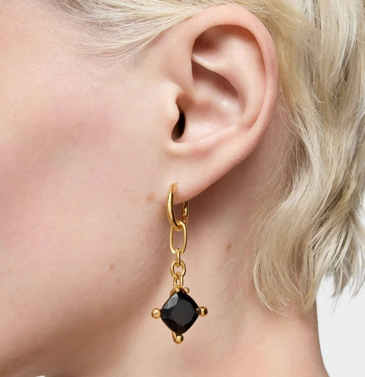Inicialmente, tenemos uno de los diseños más elegantes con los que cuenta Tous en lo que respecta a joyería. Se trata de un modelo de pendientes de aro largos con baño de oro 18 kt sobre plata y ónix de color negro, los cuales no han hecho más que llamar la atención de las mujeres más estilosas. Básicamente, estamos ante un par de pendientes largos, que parten de un aro sencillo, liso y pequeño, combinado con una cadena corta de la que cuelga una gema de ónix.