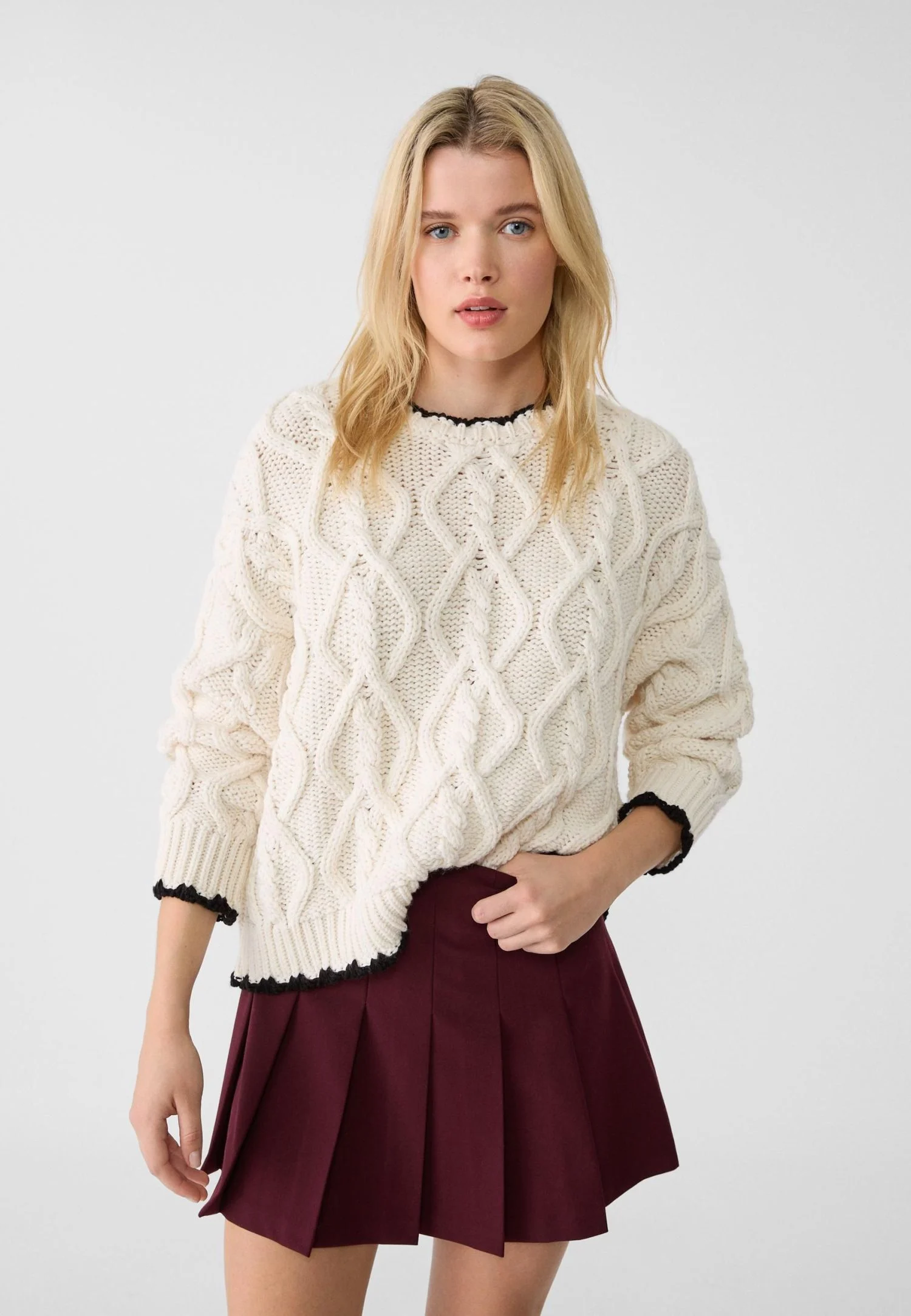 El jersey de punto trenzado con contraste es una prenda que destaca por su diseño cómodo y cómodo. Con su tejido de punto trenzado, ofrece una textura rica que aporta volumen y calidez. El cuello redondo y las mangas largas lo convierten en una opción perfecta para los días más fríos, mientras que los acabados en contraste agregan un toque de estilo único que hace que este jersey sea todo un acierto para cualquier armario.