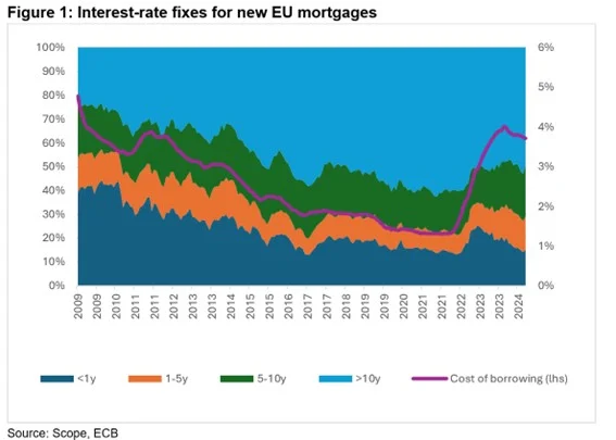 En agosto de 2024, casi tres cuartas partes de las nuevas hipotecas en Europa tenían una duración inicial de cinco años o más, mientras que la mitad tenían períodos de tipo fijo de 10 años o más, lo que protege a los prestatarios frente a las crisis de precios.