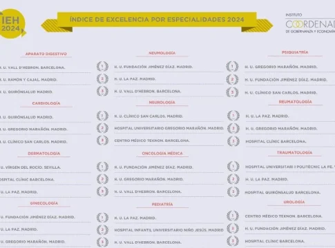 El IEH 2024 analiza anualmente la excelencia de los centros hospitalarios españoles, tanto públicos como privados, a través de tres ejes: el general, el autonómico y el de especialidades, que revela los tres principales centros en doce disciplinas médicas.