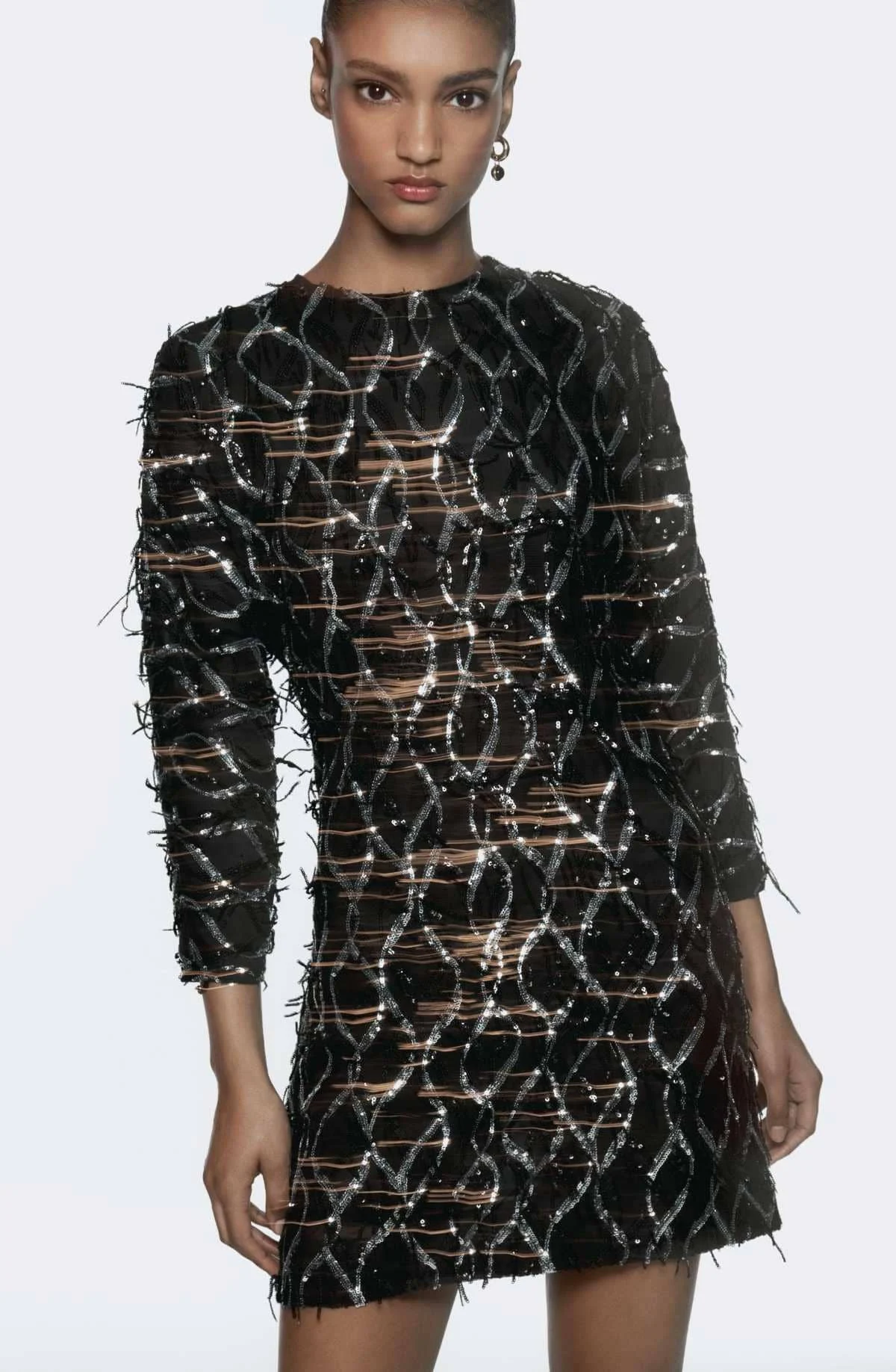 Por otro lado, nos encontramos con un diseño ideal para quienes prefieren vestidos más holgaditos. Este modelo en particular combina un cuerpo recto, un bajo corto y mangas largas con un estampado creado con lentejuelas metalizadas en color negro. En este preciso instante puedes conseguir este vestido en las instalaciones o en el sitio web de Zara por solo 39,95€.