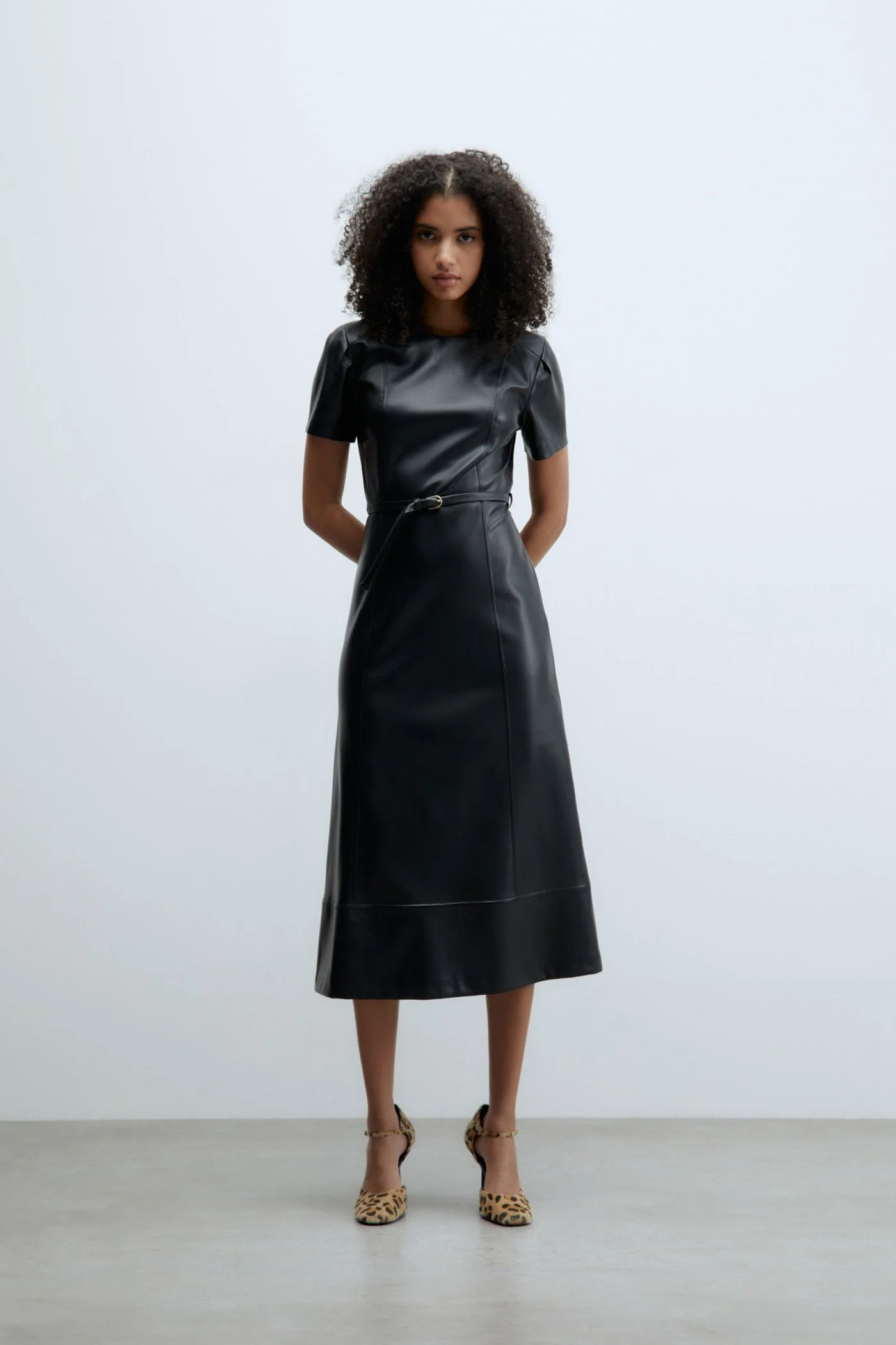 Fabricado con un efecto piel que aporta un toque de tendencia, este vestido midi combina perfectamente con botines o tacones para un look más chic o con zapatillas para un estilo más relajado. Su corte midi lo convierte en una opción versátil que puedes llevar tanto de día como de noche, brindando siempre comodidad y elegancia.
