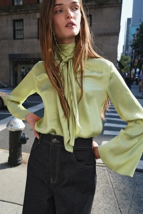 Y para finalizar, nos encontramos ante una de las alternativas más disruptivas de este listado, al menos en lo referido al color de su diseño. Destacada por su tonalidad verde pistacho, esta blusa con mangas acampanadas y lazada en el cuello también se ha convertido en una de las mejores alternativas con las que cuenta Zara en este apartado para llevar con vaqueros en ocasiones especiales. Tiene un precio de solo 29,95€ y la puedes comprar en las instalaciones o en el sitio web de la firma de Inditex ahora mismo buscando la referencia 8876/019.