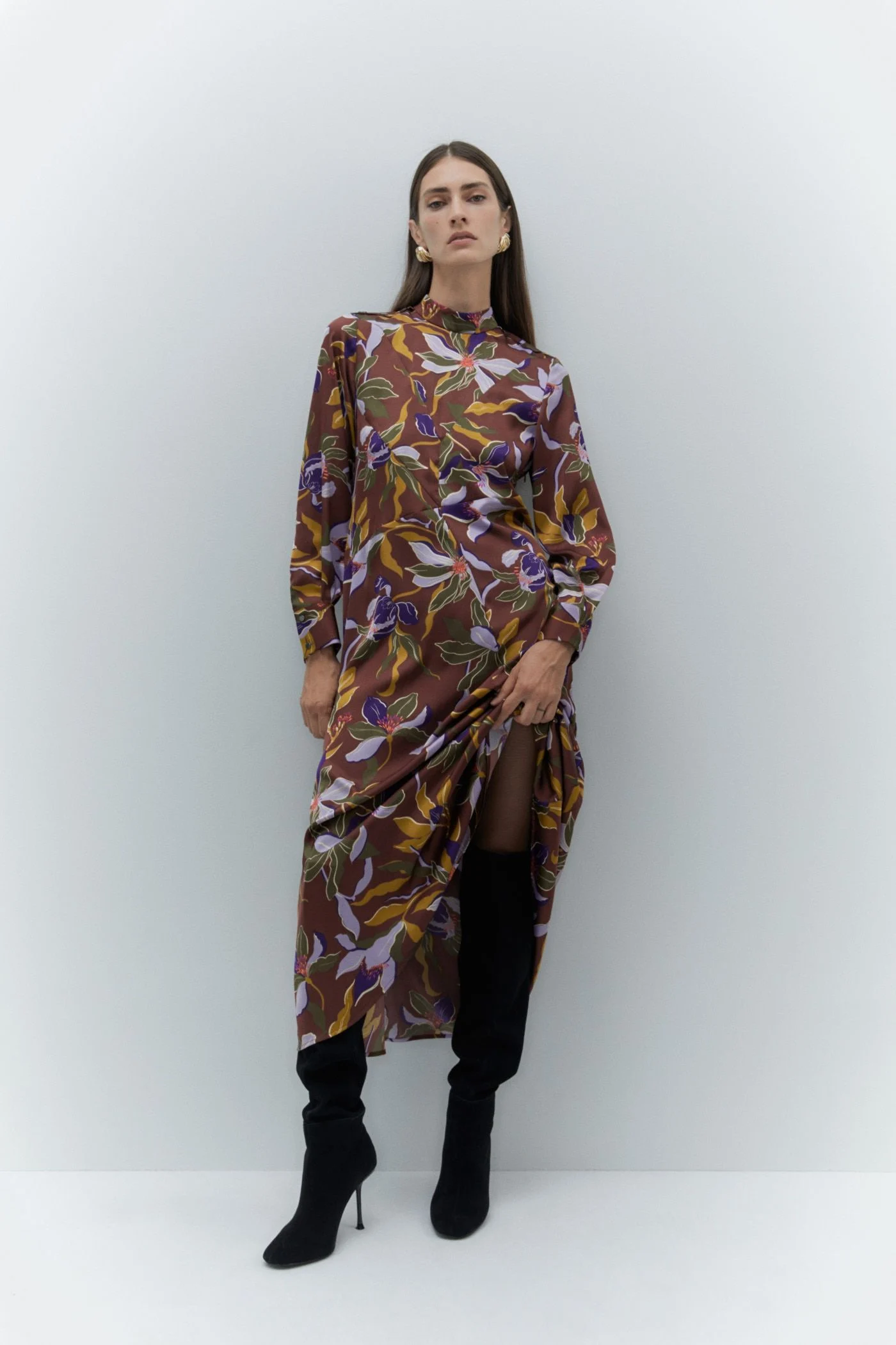 El estampado único y sofisticado de este vestido lo diferencia de cualquier otra prenda en el mercado. Su corte elegante y atemporal lo convierte en una pieza imprescindible para cualquier ocasión, ya sea una cita especial o un look casual con botas y accesorios sencillos. Además, su diseño de manga larga y cuello alto aporta un toque refinado que no pasa desapercibido.