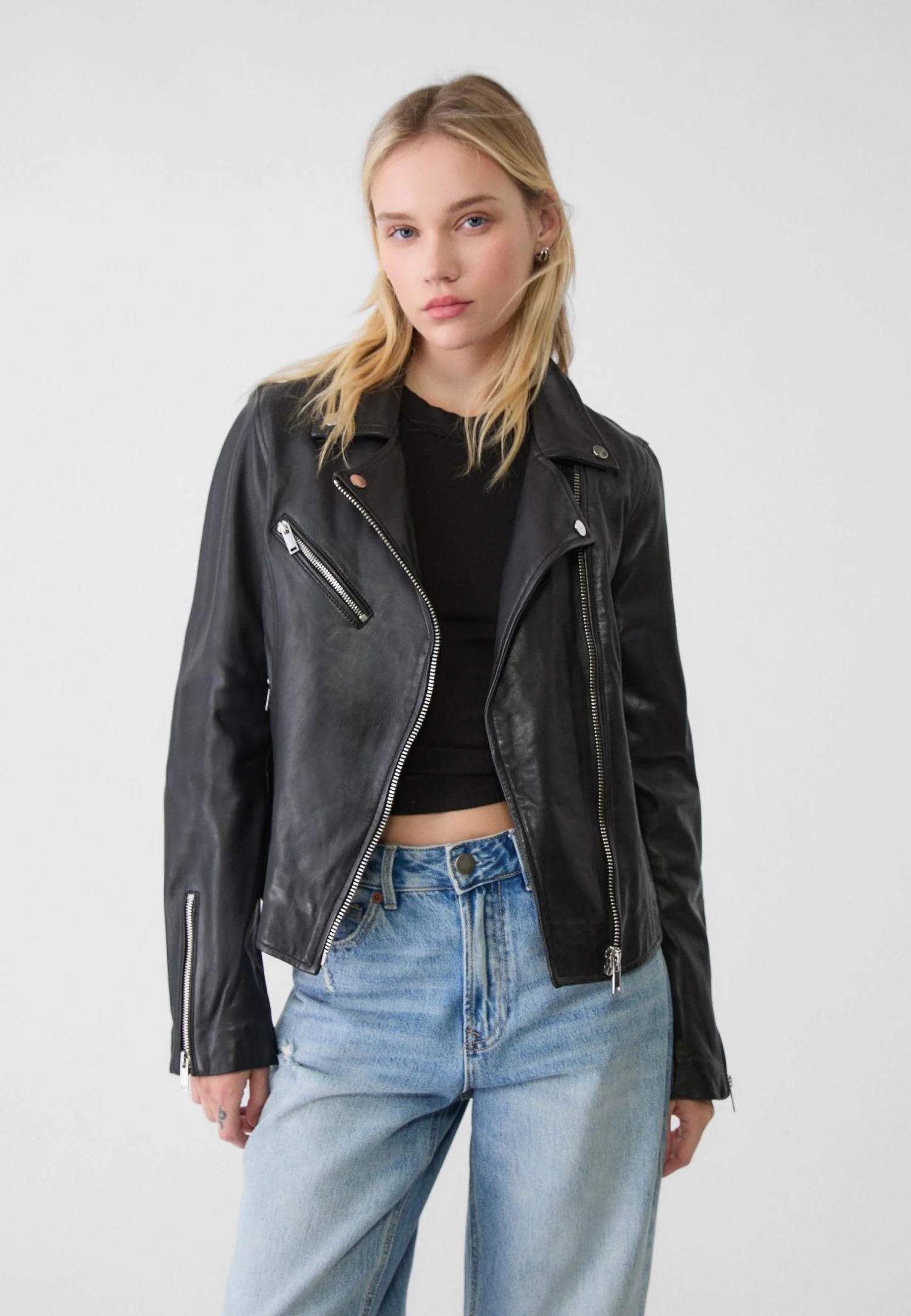 La cazadora biker de piel es la prenda esencial para quienes buscan un estilo rebelde y moderno. Con su cuello pico y solapas , esta cazadora destaca por su diseño clásico pero con detalles actuales, como el cierre de cremallera frontal y los botones de presión en la solapa . Ideal para un look urbano, es una opción perfecta para combinar con jeans, vestidos o faldas, adaptándose fácilmente a diferentes estilos.