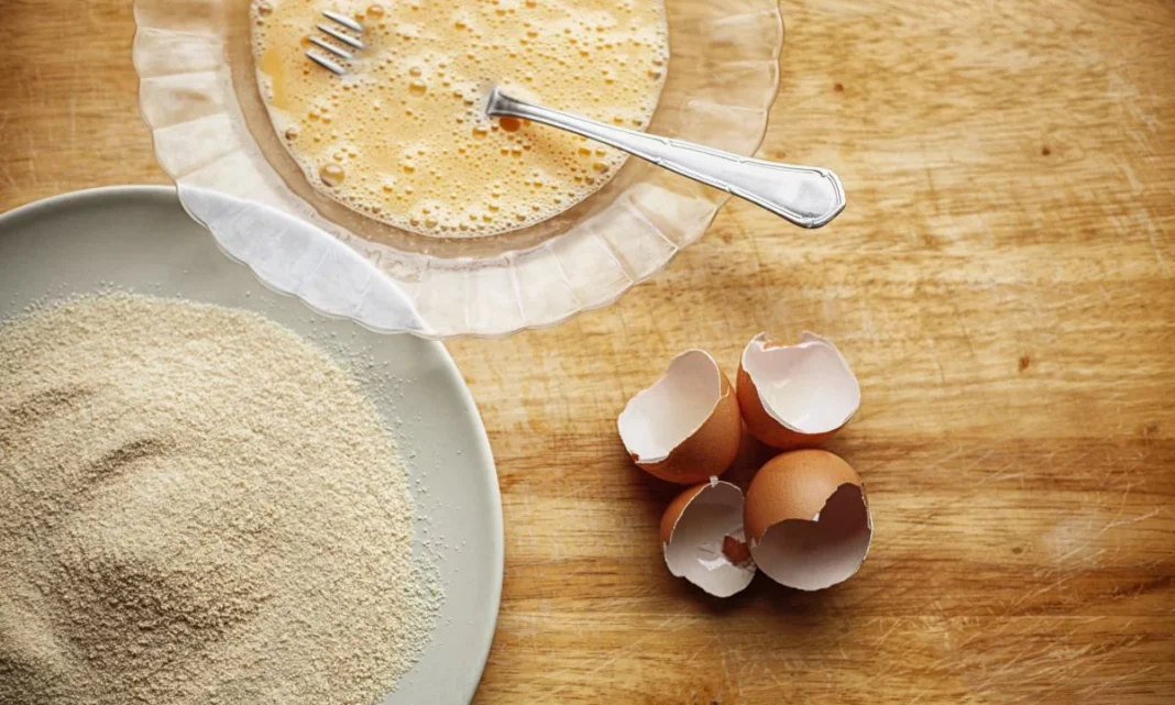 Ahora que llegaste hasta acá, déjame decirte que es la parte que más me divierte, pues es cuando debemos tomar los sándwiches de calabacín y es cuando los pasamos por el huevo batido y después por el panko. Para hacer este rebosado necesitarás batir dos huevos en un bol con una pizca de sal y las especias de tus preferencias. Este proceso de batir el huevo es claro, ya que este actuará como un pegamento que permitirá que el pan rallado se adhiera a cada San Jacobo sin ningún tipo de problema. Para asegurar un buen empanizado, es crucial que empapes muy , pero muy bien cada lado, para que el resultado final sea una textura crujiente.