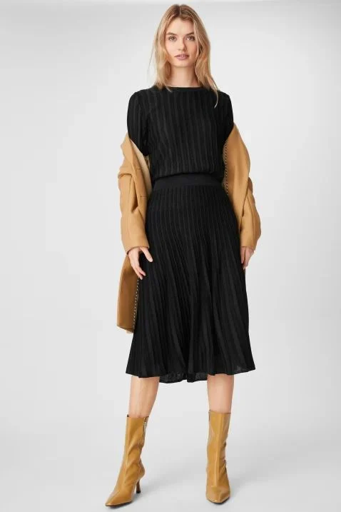 Por 39,99 €, esta falda en azul oscuro lo tiene todo para hacerte sentir como una estrella. Los finos hilos brillantes que recorren el tejido le dan un toque cómodo sin pasarse de formal. Y el plisado… ¡qué decir del plisado! Es el detalle que aporta ese aire moderno y elegante que va perfecto tanto para una cena especial como para brillar en una reunión con amigos. Esta es de esas prendas que te salvan el look en segundos.
