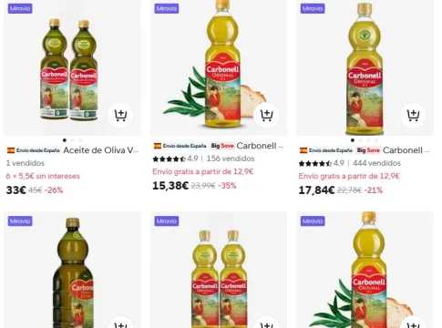 Si bien, Aliexpress no solo ofrece este pack de aceite Carbonell. A través de Miravia la plataforma ofrece al consumidor una serie de packs de varias unidades a diferentes precios, eso sí, la botella nunca supera los nueve euros. Otro de los ejemplos de estos bajos precios en la plataforma de e-commerce es tres unidades de 1 litro de aceite de oliva virgen extra Carbonell por 25,60 euros, es decir, cada botella tiene un coste de 8,83 euros; un aceite que en los supermercados no baja de los 10 euros.