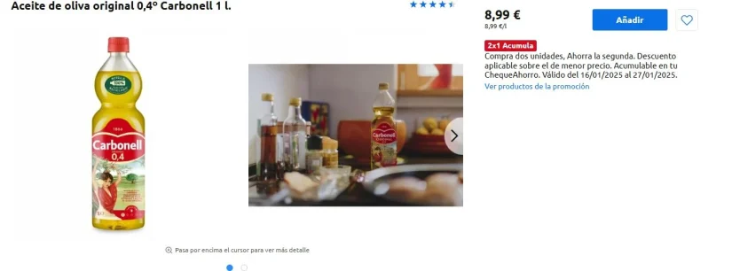 Tanto Dia como El Corte Inglés siguen al pie de la letra el pacto de no agresión en el precio del aceite. Pero, Carrefour, en vista de lo ocurrido con Aliexpress en su propia página web, cuenta con una promoción para favorecer la venta de esa marca en el establecimiento francés. En este sentido, los clientes en Carrefour podrán aprovechar la promoción de un 2×1 acumulable comprando dos unidades, el cliente ahorra la segunda.