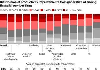 Si nos centramos en el impacto de la IA generativa en la productividad de las empresas de servicios financieros analizadas, Bain & Company ha detectado que se traduce en un aumento medio del 20% global, teniendo en cuanta todas las áreas en las que se ha utilizado (desarrollo de software, TI, servicio al cliente, marketing, departamento legal, operaciones, etc.), como expone la siguiente tabla: