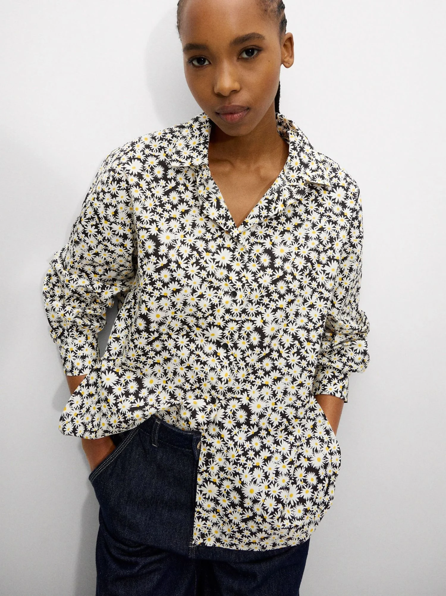 Esta camisa de algodón con estampado de margaritas es todo lo que necesitas para darle un toque fresco y elegante a tu armario. Con su corte de manga larga y su cuello con solapa, es ideal para esos días en los que quieres estar cómoda pero con un look muy top. El cierre con botones le da un toque clásico, pero las margaritas son las que realmente hacen la diferencia, añadiendo un aire romántico y juvenil.