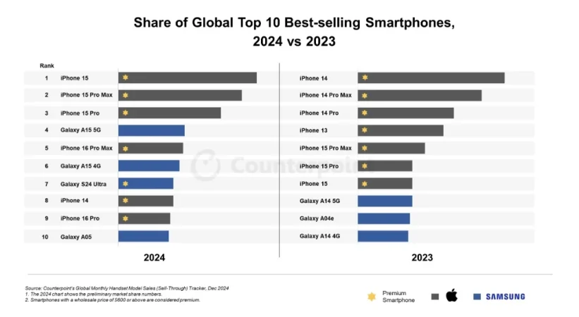 El ilustrativo informe Global Handset Model Sales Tracker de la consultora de origen chino Counterpoint Research señala el extraordinario desempeño de Apple y su último smartphone estrella, a pesar de los vaivenes que la competencia ha pretendido darle. No obstante, señala que Samsung tuvo un alarmante para Apple buen desempeño en 2024, ya que se aseguró cuatro lugares en la lista, frente a los tres de 2023.