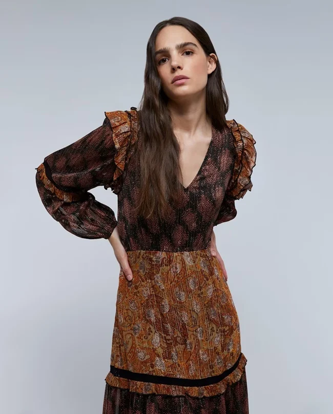 Si quieres lucirlo, deberías fichar en El Corte Inglés este vestido midi (antes, 99,90 euros; ahora, 39,90 euros) de Scalpers con estampado paisley en tonos marrones. Confeccionado en tejido fluido, cuenta con escote de pico, manga larga terminada en puño elástico y volantes.