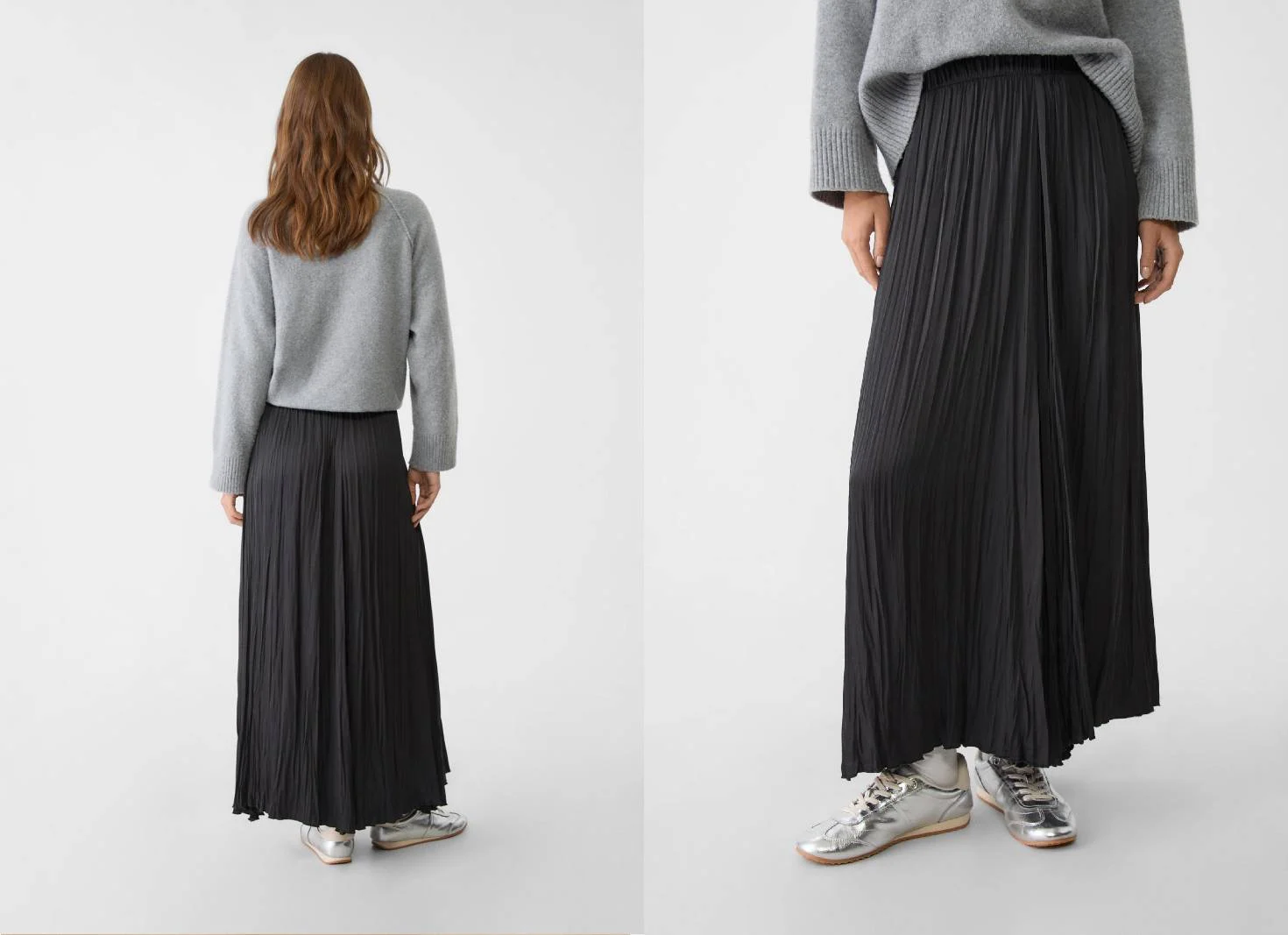 Pero para los que no pueden gastar grandes sumas de dinero, Stradivarius tiene una versión más económica pero no menos estiloza que combina bien con jerséis y con zapatillas. Se trata de la falda fluida larga satinada que tiene un valor de 25.99 euros y es un verdadero furor. Está confeccionada en tejido satinado con textura arrugada, es de tiro alto con cintura elástica y se puede encontrar en varios colores. Las mujeres la eligen para los grandes eventos, con botas altas, pero también para la oficina con las tenis de la última temporada.