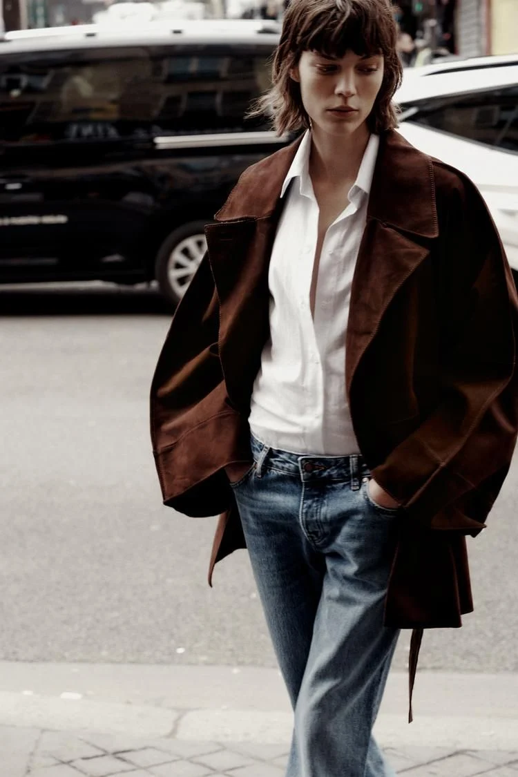 El Trench Corto Oversize Piel Ante de Zara es la definición de sofisticación y estilo desenfadado en una sola prenda. Confeccionado en 100% piel, este trench se siente tan lujoso como se ve. Su corte oversize le da ese toque relajado pero chic, ideal para quienes buscan comodidad sin sacrificar elegancia. El color marrón es perfecto para combinar con todo, desde un look casual con jeans hasta algo más arreglado con una falda midi. ¡Vas a querer llevarlo todo el tiempo!