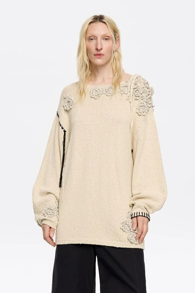Lo que realmente destaca es el logo hecho a mano, que da ese aire artesanal que tanto nos gusta. Es el tipo de prenda que sabes que no verás en todas partes, lo que lo convierte en una inversión que vale cada euro. Si buscas un toque de frescura y originalidad en tu armario, este jersey será tu nuevo favorito para esos días en los que quieres sentirte cómodo, pero con mucha onda. ¡El color arena y las flores de crochet harán que todo el mundo!