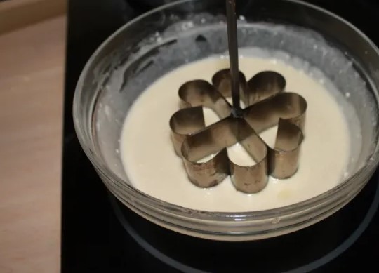 - Saca el molde metálico caliente del aceite y sumérgelo en la masa hasta la mitad (no se debe sumergir completamente, porque después la flor no se despegará completamente).
