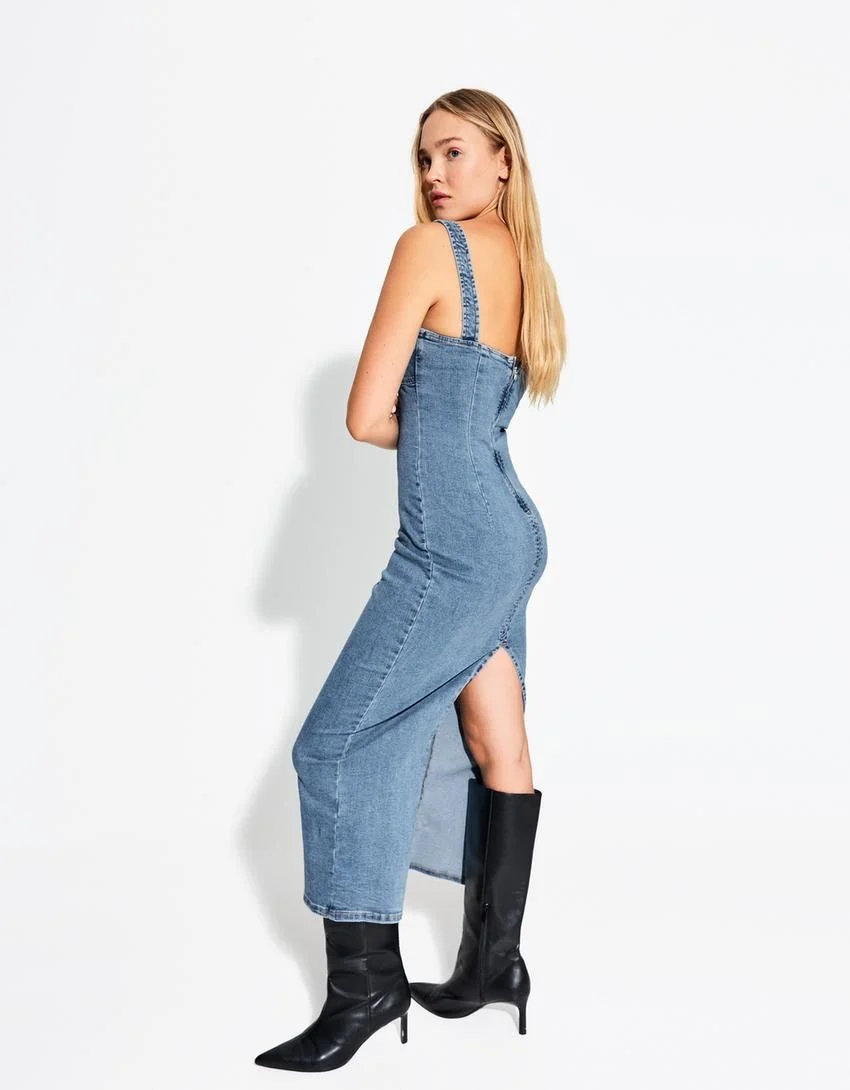 Imagínate salir a la calle con un vestido que tiene todo el rollo vaquero que amas, pero sin el drama de ajustar cinturones o pelearte con cremalleras rebeldes. Bershka ha soltado este denim que es pura vibra casual, con un corte que te hace tipazo y un aire que dice “sí, soy cómoda pero también molona”. Lo vi en la tienda y ya me lo imaginé con zapatillas para el día o con botas para un plan nocturno.