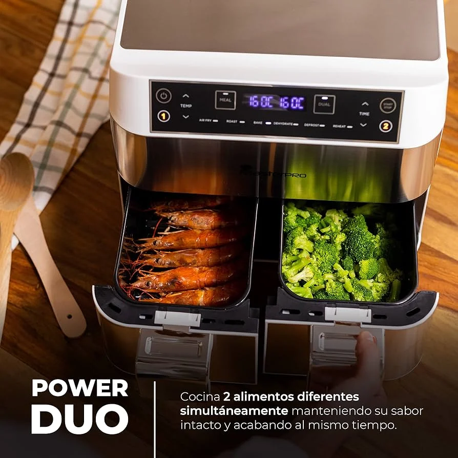 Carrefour nos trae una oferta que nos ha emocionado con su freidora de aire. Si estás buscando un estilo de vida más saludable y una nueva forma de cocinar, Carrefour tiene la opción perfecta. La freidora de aire MasterPro Power Duo modelo XL con un segundo compartimento y una capacidad de 7.6 litros, ideal para familias grandes, y para aquellos que disfrutan de elaborar varias preparaciones al mismo lapso. Ahora, gracias a una oferta especial, este electrodoméstico por debajo de los 100 euros, una oferta que no muchos no podemos rechazar.
