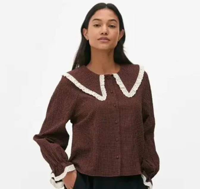El color marrón chocolate se ha colado como uno de los tonos favoritos para esta temporada, y sí, ¡también es perfecto para la primavera! Esta blusa de Primark tiene todo lo que necesitas para lucir sofisticada y con estilo. Con un cuello bebé y un tejido de cuadros vichy, esta prenda se convierte en la pieza perfecta para darle un toque único a tus looks. Además, el marrón chocolate es muy fácil de combinar y aportará un aire elegante y cálido a tu vestuario.