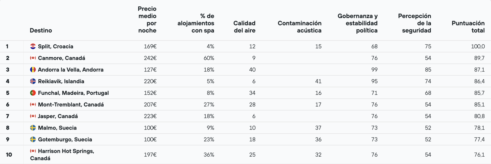 Split, la capital croata, encabeza la clasificación. Esta encantadora ciudad costera ofrece una combinación perfecta de historia, cultura y tranquilidad. Con sus calles empedradas, el impresionante Palacio de Diocleciano y las playas de aguas cristalinas, Split respira relajación. Canmore en Canadá, y Andorra la Vella también recibieron altas puntuaciones en todas las categorías, lo que les valió el segundo y tercer puesto en la clasificación.