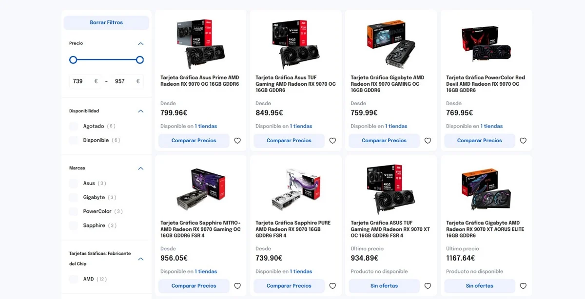 Si miramos los precios recomendados oficiales, AMD se posiciona como la opción sensata en cuanto a precio por FPS. La RX 9070 XT salió con un precio recomendado en España cercano a los 680€, aunque las tiendas están inflando su precio hasta superar los 1000 € por la escasez de unidades. Si utilizamos un comparador de precios de componentes y ordenadores, en el momento de redactar esta publicación, vemos que la RX 9070 está disponible en una única tienda y su precio parte desde los 739,90€ mientras que la RX 9070 XT actualmente está agotada en todas las tiendas y su último precio más bajo registrado fue de 934,89€.