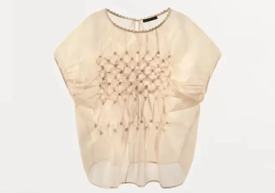 Una pieza en organza color crudo, con cuerpo de tejido de nido de abejas y puntilla se puede combinar con faldas o pantalones clásicos y su precio es de 29.95 euros
