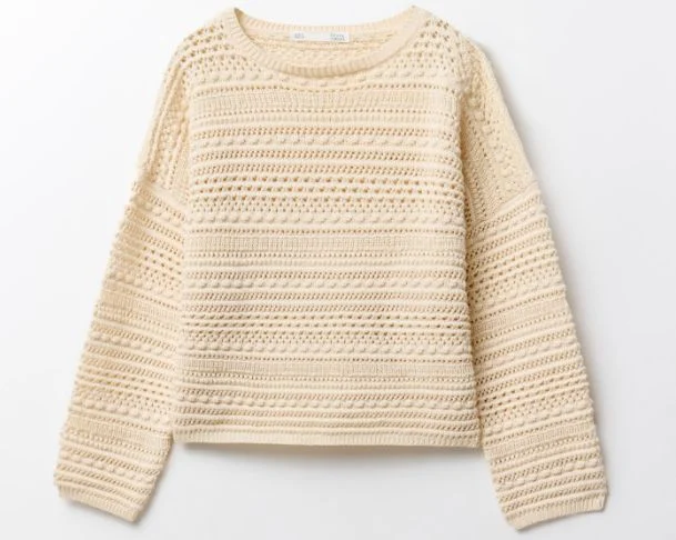 El jersey de punto calado se ha convertido en uno de los grandes protagonistas de las pasarelas de la primavera 2025 gracias a marcas como Chloé y Ralph Lauren. Son elegantes, frescos, de estética boho-chic, y, además, quedan de maravilla con pantalones blancos anchos. En Sfera, podemos encontrar este modelo en beige de punto calado con cuello redondo y patrón ligeramente oversize.
