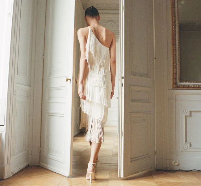 Los flecos han ganado mucha popularidad en la moda nupcial porque aportan un toque divertido y dinámico al look. Además, permiten que te sientas cómoda y libre mientras te mueves, lo que los hace perfectos para una boda civil o una celebración menos formal. Si eres una novia atrevida que busca romper con lo tradicional, este vestido te dará todo lo que necesitas para sentirte especial y diferente.