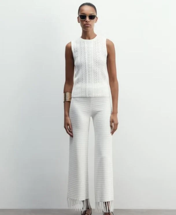El top de punto con detalles en flecos añade un toque bohemio que es súper favorecedor. Los pantalones también son de punto, lo que asegura comodidad durante todo el día. Combínalo con sandalias de cuña y algunos accesorios dorados para un look más sofisticado, o con botines para algo más casual.