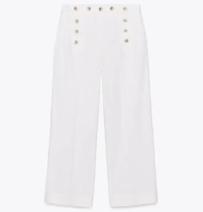 Estos pantalones son una opción más original que los anteriores, con botones ornamentales dorados en la parte delantera y una pierna acampanada que otorgan una sensación retro. Estos pantalones son una opción más original que los anteriores, con adornos dorados en el Lower, ideal para aquellos que buscan algo diferente, pero mantienen el toque elegante. Mezclarlo con zapatos blancos y poseerá un conjunto impecable para cualquier ocasión. Disponible por 39.95 euros.