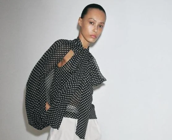 Las transparencias se han convertido en una de las principales tendencias de este año, y Zara lo sabe. Esta blusa capa con lazo es ideal para lucir con estilo sin perder la elegancia. Lo mejor de todo es que la transparencia no es tan pronunciada, y si la combinas con un body negro o sujetador delicado, conseguirás un look chic y romántico.