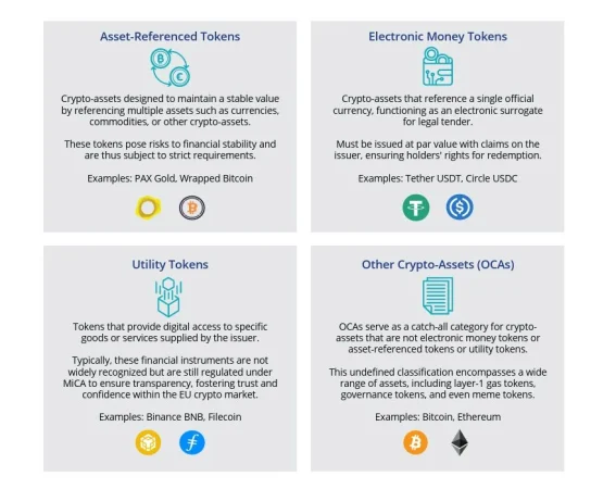 La MiCA define un cripto activo como una «representación digital de valor, o derechos, que pueden transferirse y almacenarse electrónicamente utilizando tecnología de libro mayor distribuido (DLT)». Clasifica estos activos en los cuatro tipos siguientes:
