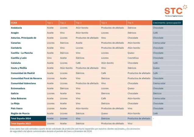 El cuarto estudio sobre el hurto en los supermercados que lanza STC, indica que el aceite, los licores y los vinos, son las tres categorías de los productos más hurtados en las diferentes cadenas de distribución españolas. A estos productos, se le suman los ibéricos, los productos de afeitado, y las conservas tanto de atún como de bonito.
