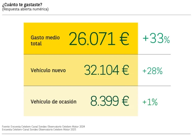 Aumenta el gasto medio previsto en vehículosEl gasto medio previsto para la compra de un vehículo en 2025 se incrementa un 20%, alcanzando los 30.735€. En el caso concreto del segmento de los vehículos nuevos, se sitúa en los 30.758€, un 4% más que en 2024. En cuanto al coche de ocasión, con un descenso del 7% respecto al año anterior, el gasto medio sería de 13.405€.