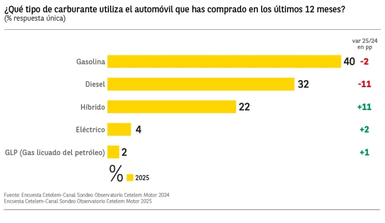 La segunda mayor intención de compra es el vehículo de gasolina con un 22% de las menciones, aunque descendiendo un punto. En tercer lugar, un 15% compraría un coche diésel, mismo porcentaje que en el año anterior; y un 13% adquiriría uno eléctrico, porcentaje que desciende tres puntos respecto a la intención mostrada en 2024. Por último, solo un 1% tiene intención de comprar un coche de GLP (gas licuado del petróleo).