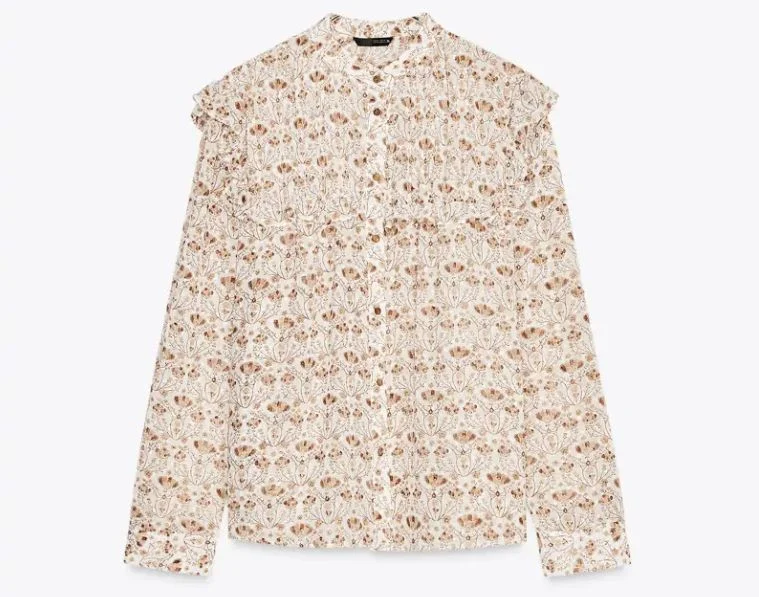 Otra blusa con volantes, pero esta vez en los hombros. Con un estampado floral y mangas largas, esta prenda es ideal para las que buscan algo femenino y ligero para sus looks primaverales. Combínala con pantalones de lino o una falda larga para un toque bohemio.