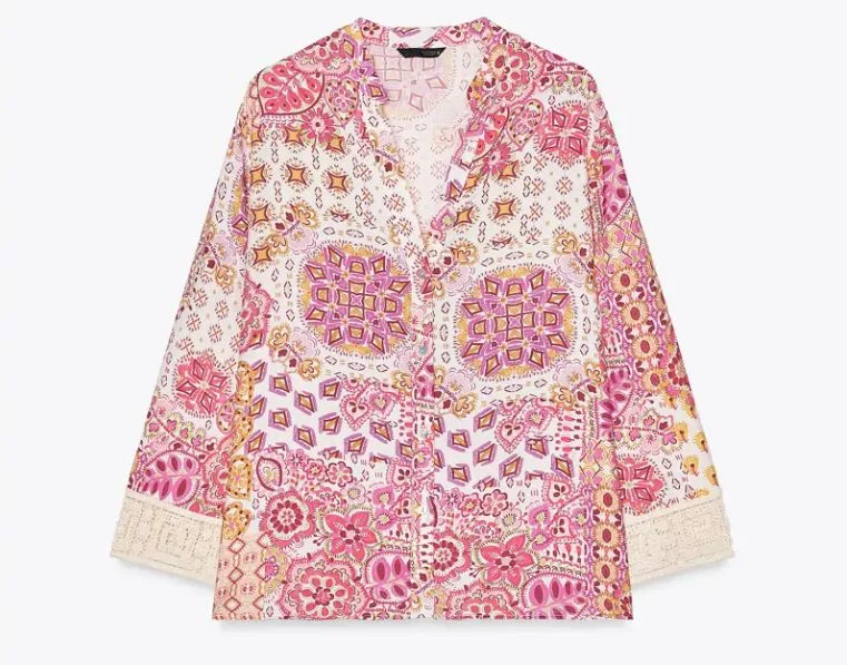 Para las que se atreven con un estilo más atrevido, esta blusa de estampado multicolor es ideal. Con mangas terminadas en tejido guipur, se puede combinar perfectamente con pantalones lisos para equilibrar el look y no restar protagonismo al estampado. Ideal para una reunión de trabajo o una salida casual.