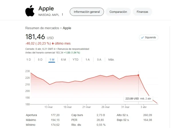 La valoración de la empresa ha caído más de medio billón de dólares en los dos últimos días de la semana pasada, y las acciones, que han caído un 19% desde el anuncio de aranceles, sufrieron su peor desplome en tres días desde las secuelas de la burbuja puntocom en 2001. La caída borró más de 637.000 millones de dólares en valor de mercado del gigante tecnológico.