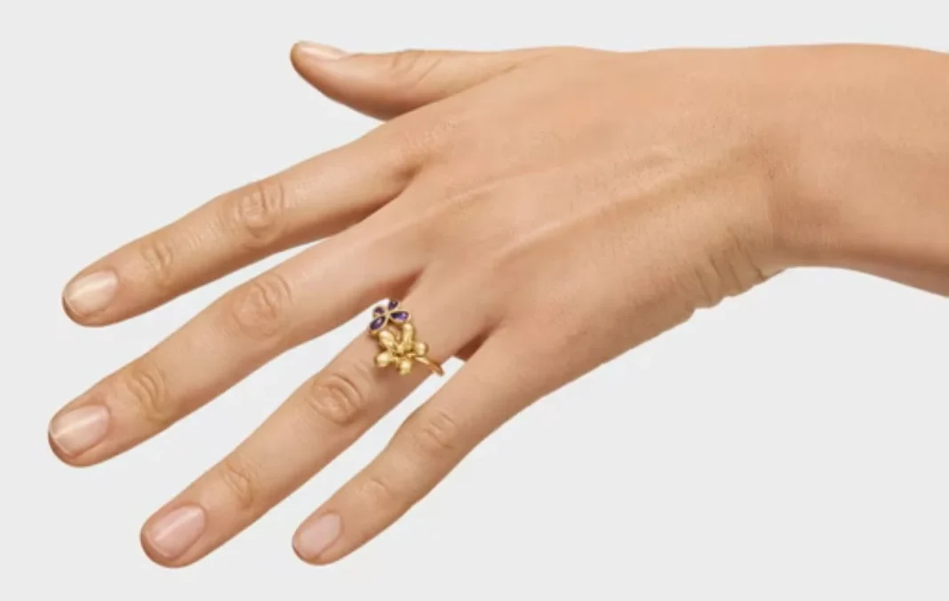 Otro must-have de esta colección es el anillo con baño de oro de 18 kt sobre plata y amatista Daisy, diseñado especialmente para complementar los pendientes. Con una delicada flor en el centro y una pequeña mariposa al lado, este anillo es perfecto para quienes buscan una pieza romántica y llena de simbolismo.