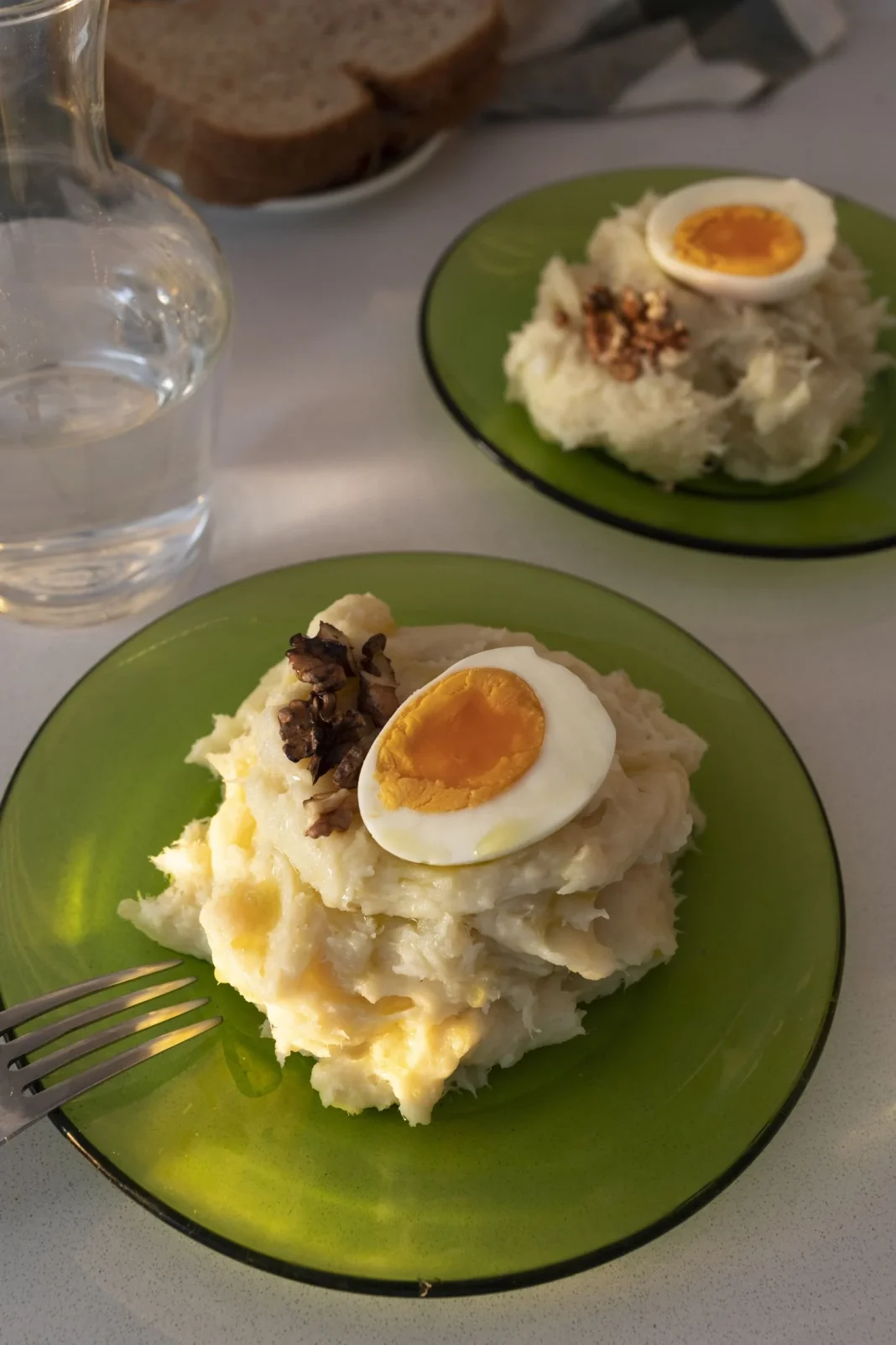 – Una vez que las patatas estén tiernas, escúrrelas y colócalas en un bol grande. Añade el bacalao desmenuzado y el sofrito de ajo caliente. Agrega el resto del aceite de oliva y mezcla bien.