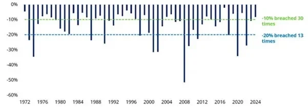En los mercados bursátiles mundiales (representados por el índice MSCI World), se produjeron caídas del 10% en 30 de los 53 años naturales anteriores a 2025. En la última década, esto incluye 2015, 2016, 2018, 2020, 2022 y 2023.