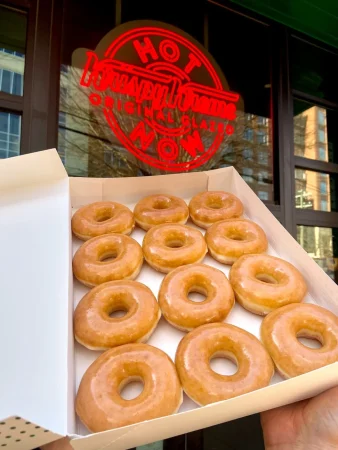 Además, también ofreceremos una variedad de cafés y bebidas frías y calientes para complementar a nuestros productos. Muchos de nuestros consumidores optan por comprar una docena de Glaseados Originales, o de variedades, y compartirla con sus seres queridos o compañeros de trabajo. Pero los más fieles seguidores, preferirán ir cuando la luz roja ‘HOT NOW’ esté encendida, y llevarse el producto recién hecho.