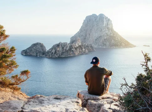 Es Vedrà no es simplemente una roca en medio del mar; es un icono paisajístico de primer orden, una presencia casi totémica que define el horizonte suroeste de Ibiza. Con sus casi cuatrocientos metros de altura surgiendo abruptamente del azul intenso del Mediterráneo, su perfil escarpado y majestuoso resulta inconfundible, una estampa que ha inspirado a artistas, fotógrafos y viajeros durante generaciones.