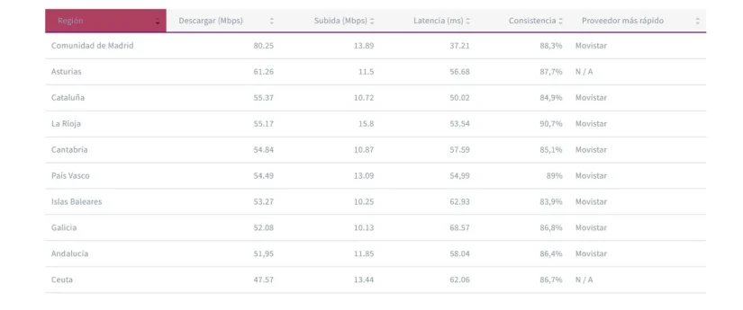 Ookla indica que los datos marca cómo Asturias ocupó el segundo lugar en cuanto a velocidad de descarga móvil, seguida de Cataluña en tercer lugar. En el otro extremo, Navarra registró la velocidad media de descarga móvil más lenta, con 40,85 Mbps, seguida de Castilla-La Mancha y Castilla y León. En definitiva, según los datos, Movistar fue el proveedor más rápido en 15 regiones.